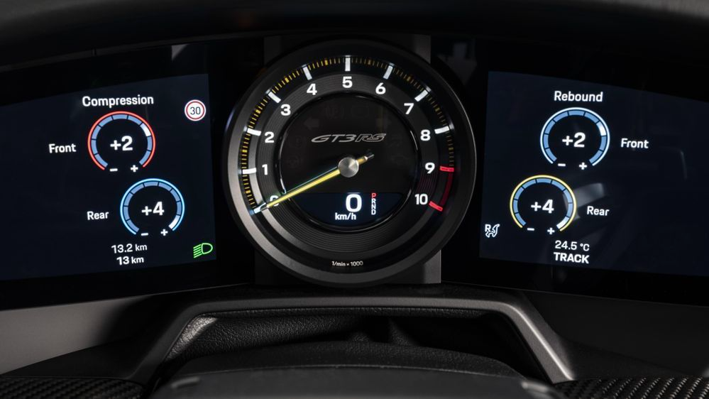 จากเทคโนโลยีระบบแอโรไดนามิกที่ล้ำสมัย องค์ประกอบของช่องรับลมด้านหน้าและด้านหลังสามารถปรับได้  ซึ่งเมื่อทำงานร่วมกันองค์ประกอบเหล่านี้สามารถสร้างแรงกดมหาศาลที่ 409 กิโลกรัม ณ ความเร็ว 200 กิโลเมตรต่อชั่วโมง ทำให้ 911 จีที3 อาร์เอส (911 GT3 RS) ใหม่ สามารถสร้างแรงกด (Downforce) ได้มากเป็น 2 เท่าของรุ่นก่อนหน้าอย่าง 991.2 และมากเป็น 3 เท่าจากรุ่น 911 จีที3 (911 GT3) ที่ความเร็ว 285 กิโลเมตรต่อชั่วโมง มีแรงกดรวมถึง 860 กิโลกรัม