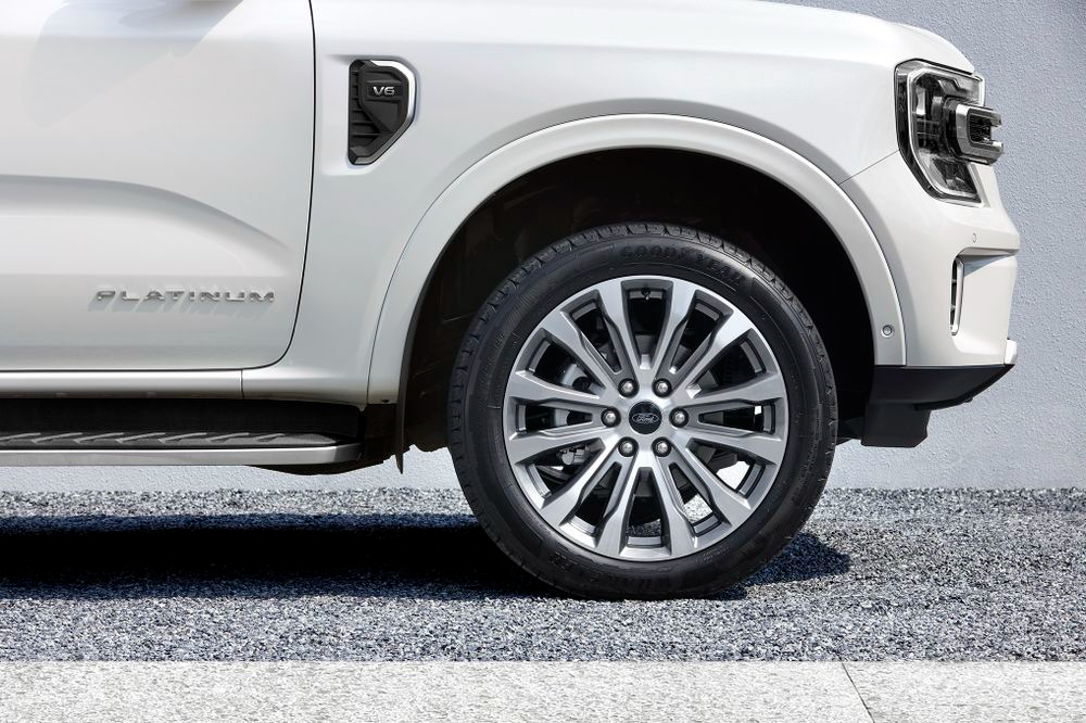 แตกต่างด้วยรูปลักษณ์ที่หรูหรา ตั้งแต่กระจังหน้าขนาดใหญ่ดีไซน์ใหม่ที่เป็นเอกลักษณ์เฉพาะสำหรับฟอร์ด เอเวอเรสต์ แพลทตินัม พร้อมตัวอักษร PLATINUM สีโครเมียม 3 ตำแหน่งบนฝากระโปรงหน้า บานประตูคู่หน้า และฝาท้าย หลังคาสีดำ (Black Roof) ตราสัญลักษณ์ วี 6 โดดเด่นบนช่องระบายอากาศด้านข้างตัวถัง และล้ออัลลอยขนาด 21 นิ้ว พร้อมยางขนาด 275/45 R21 สะท้อนถึงความสปอร์ตและหรูหรา พร้อมระบบไฟส่องสว่างแบบแบ่งโซน (Zone Lighting) ควบคุมการเปิดไฟส่องสว่างภายนอกตัวรถ เมื่อต้องการแสงสว่างในการทำกิจกรรมต่างๆ ในตอนกลางคืน