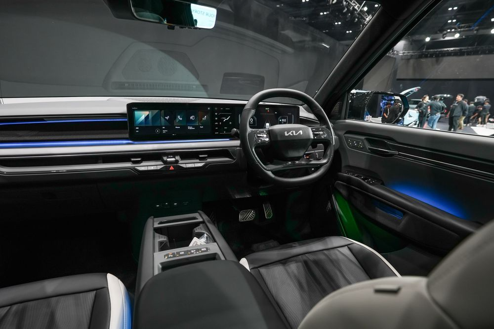 ภายในของ Kia EV9  มาพร้อมกับ ‘Panoramic Wide Display’ ที่มีจอแสดงผลแบบคลัสเตอร์ขนาด 12.3 นิ้ว หน้าจออินโฟเทนเมนท์แบบสัมผัสขนาด 12.3 นิ้ว และจอแสดงผลสำหรับระบบปรับอากาศภายในห้องโดยสารขนาด 5.3 นิ้ว ช่วยให้สามารถควบคุมฟังก์ชันต่างๆ ได้อย่างง่ายดายและส่งผ่านข้อมูลได้อย่างมีประสิทธิภาพ นอกจากนี้ โหมด EV ยังช่วยให้ผู้ขับขี่สามารถตรวจสอบและควบคุมข้อมูลเฉพาะเกี่ยวกับ EV ทั้งหมดได้ในโหมดเดียว