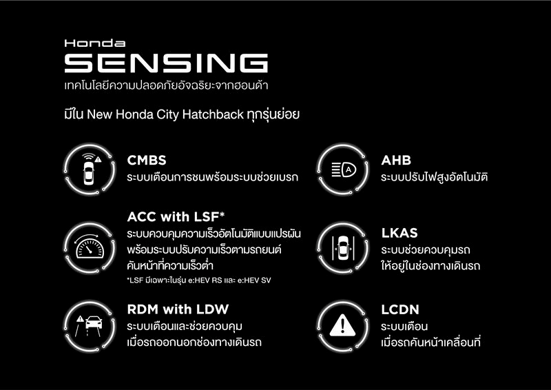 เทคโนโลยีความปลอดภัยอัจฉริยะ ฮอนด้า เซนส์ซิ่ง (Honda SENSING) ทำงานผ่านกล้องมุมมองกว้างด้านหน้า ช่วยตรวจจับรถยนต์ คนเดินถนน จักรยาน และจักรยานยนต์ได้อย่างมีประสิทธิภาพ ประกอบไปด้วย 6 ฟังก์ชันการทำงานหลัก ๆ ดังนี้